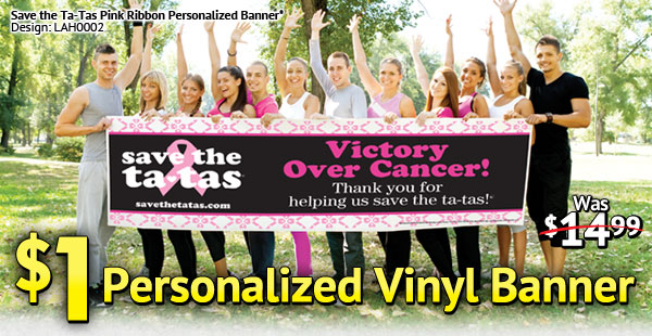 * To get your ONE DOLLAR CUSTOM BANNER, enter VST3AX in the promotional code box at checkout. Limited to the first 1,000 orders. A credit for $13.99 will appear with your order confirmation before submission online. Offer applies to the 18×54-inch banner product size (Items:B1118, K1118, K1154 and B1154) and is valid for online orders fromShindigz.com only. Offer can be redeemed once per customer, per organization, or household. The One Dollar Banner offer cannot be combined with any other offer or previous orders and does not apply to Attach’N’Go banners. Shipping charges will apply. Expires 8/15/12, 11:59 PM EST.