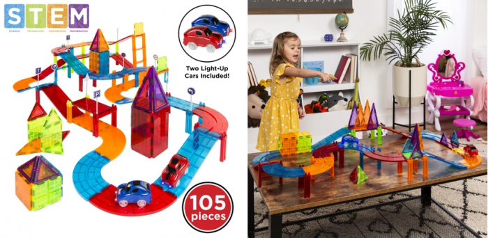 105-Piece Kids Magnetic Tile Car Race Track STEM Building Toy Set w/ 2 Cars for $52.99(Reg $79.99)