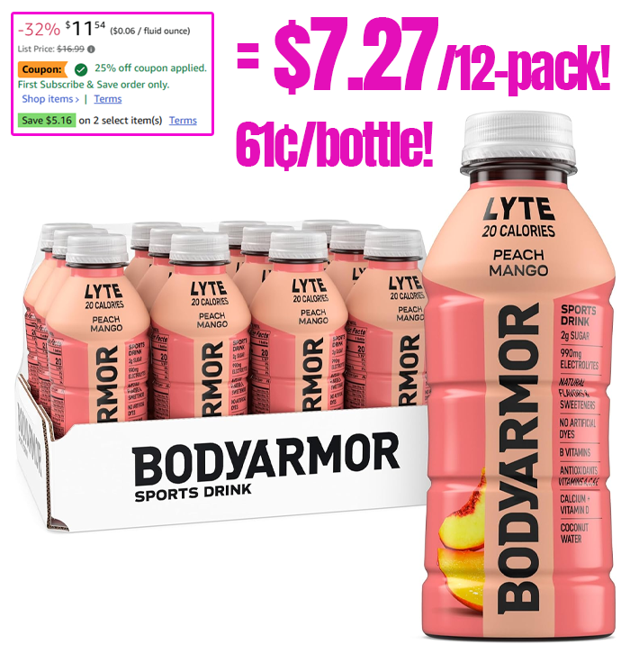 12-Pack BODYARMOR LYTE Peach Mango Sports Drink for $7.27 Each (Reg $16.99)