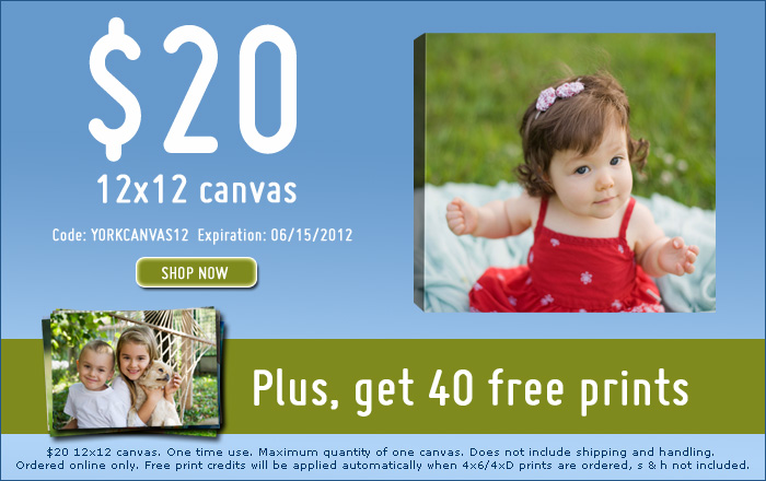 Just head on over to York Photo and use promo code YORKCANVAS12 when you check out. You will get a 12×12 Canvas for only $20! Plus, the free 40 prints will automatically be added to your account.