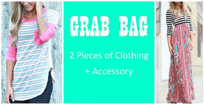 Each surprise bag will include two pieces of clothing (tops, bottoms, basic cami, sports bras, skirts, etc.) + an adorable accessory (necklace, earrings, scarf, socks, nail polish, sunglasses, lip balm, etc.). You can see photos of some possibilities of what you might receive HERE.