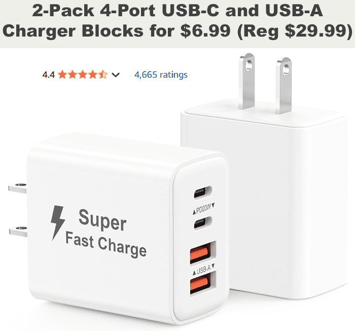 2-Pack 4-Port USB-C and USB-A Charger Blocks for $4.99 (Reg $12.99)!