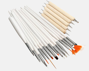- Get all the nail art tools you will ever need in one convenient set! This set comes with 20 nail art tools. It includes 15 nail art tools have white pearlized, wooden handles, 1 brush w/ angled head, and 4 double sided dotting tools that are unpainted wood. Tools are stored in a black, roll out pouch with 2 magnetic closures – great for organizing or traveling.