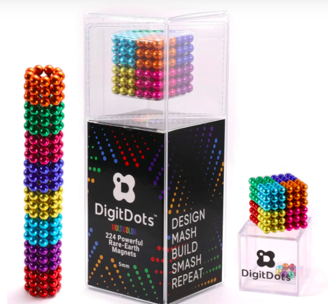 DigitDots Multi-Colored 5mm magnet balls attach tightly together, allowing you to create limitless designs. DigitDots stimulate creative thinking, engaging both the right and left side of your brain. They’re SO FUN to play with and make great gifts for adults and teens! NOTE: Because these have very strong magnets, they are recommended only for ages 14+; not suitable for children.