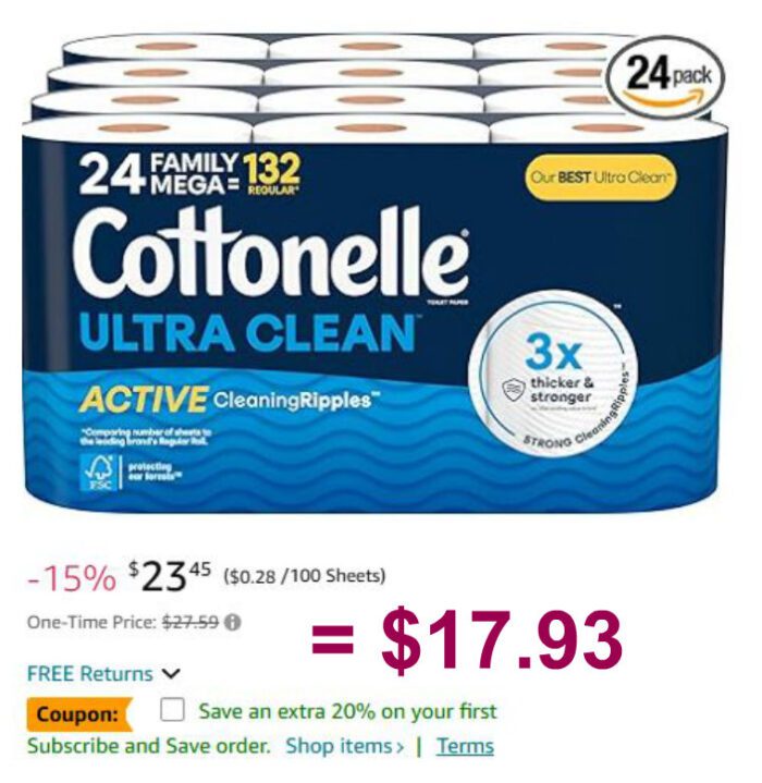 24 Mega Rolls Cottonelle Ultra Clean Toilet Paper with Active CleaningRipples Texture $17.93 or $20.69