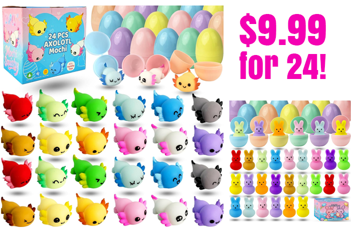 24 Pack Prefilled Easter Eggs with Axolotl or Bunny Mochi Squishy Toys for $9.99!