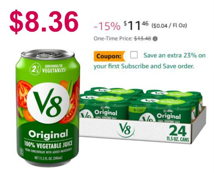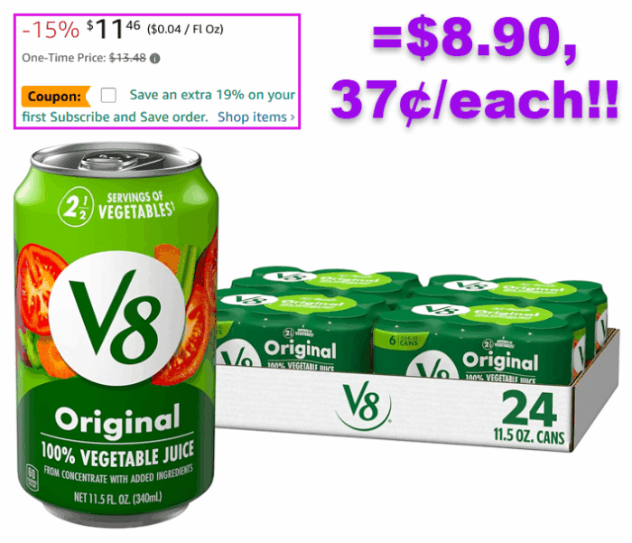24-Pack V8 Original 100% Vegetable Juice for $13.48