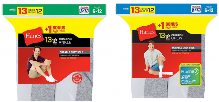 Add 2 of Hanes Men’s Cushion Crew Socks 13 Pack or Hanes Men’s Cushion Ankle Socks 13 Pack for $15 = $30
