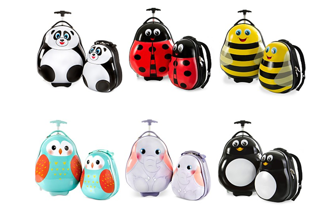 These 2-Piece Heys Travel Tots Luggage Sets are so cute! Choose from six whimsical designs. Each set includes a hard suitcase with wheels and a matching hard backpack. You can attach the backpack to the suitcases’ quick-release handle.