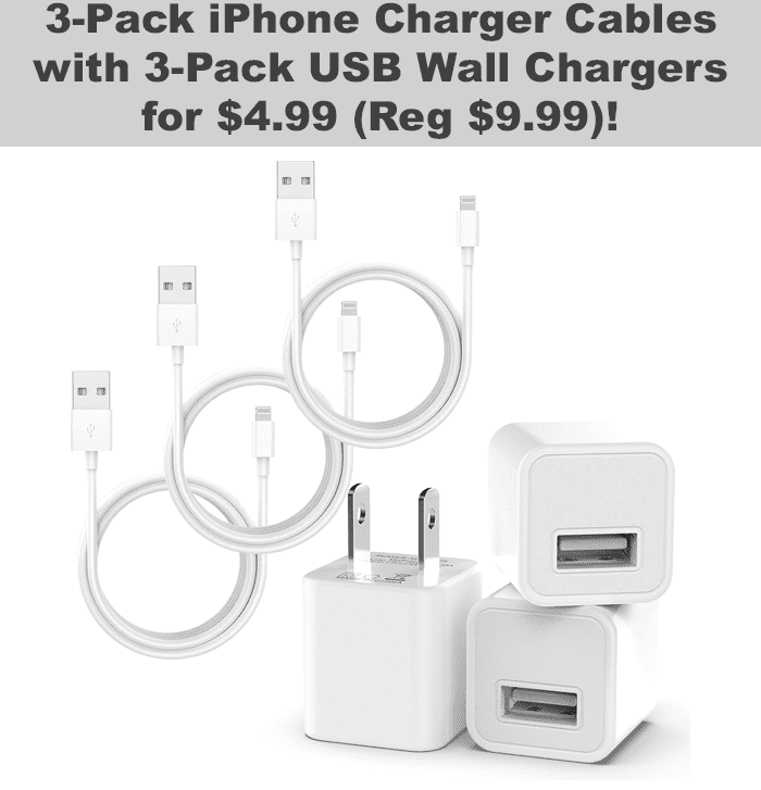 3-Pack iPhone Charger Cables with 3-Pack USB Wall Chargers for $9.99