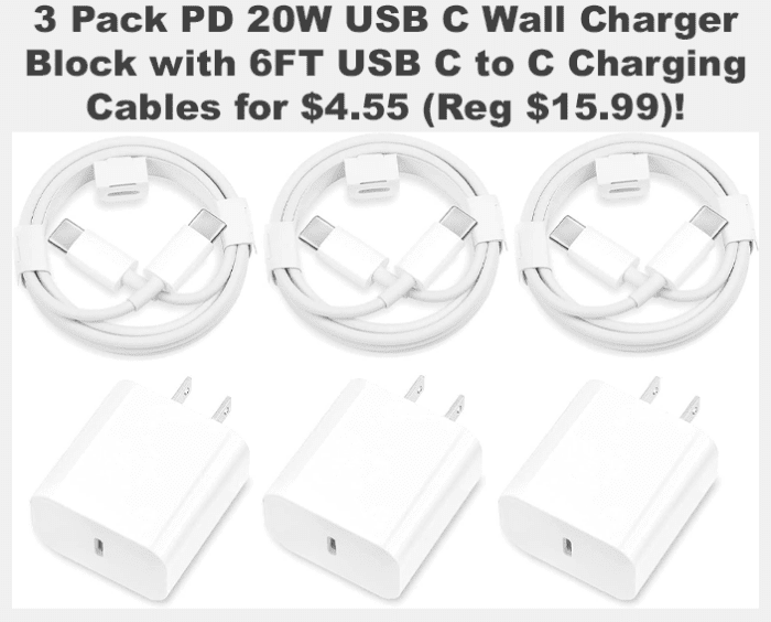 3 Pack PD 20W USB C Wall Charger Block with 6FT USB C to C Charging Cables for $9.09 (Reg $15.99)!