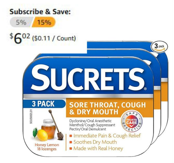 3-Pack Sucrets Sore Throat & Cough Lozenges, Honey Lemon $7.08