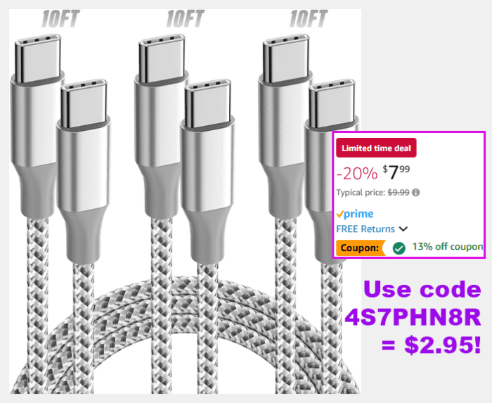3-Pack USB C 10ft Fast Charging Cords for $7.99 (reg $9.99)