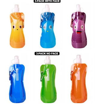 Collapsible water bottles – BPA Free, with a carabiner clip.  These would be great for hiking!  You can grab a 3 pack for $5.99 + shipping = $8.98 total or about $3 each.  You can choose between face or no face on the bottle.
