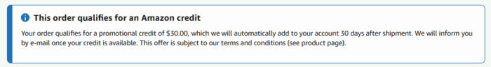 - Promotional credit will be automatically added to your account 30 days after shipment. At that time, you will receive an e-mail from Amazon that indicates the dollar amount of the promotional credit and that the dollar amount of the credit has been added to your customer account. The e-mail will also provide instructions on how to redeem the promotional credit.