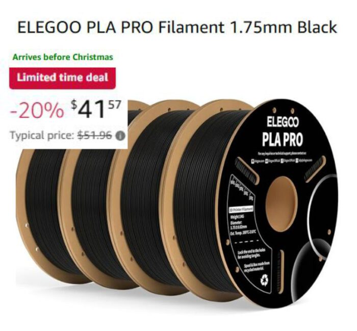 4-Pack ELEGOO PLA PRO Filament 1.75mm Black 4KG $41.57 (reg $51.96)