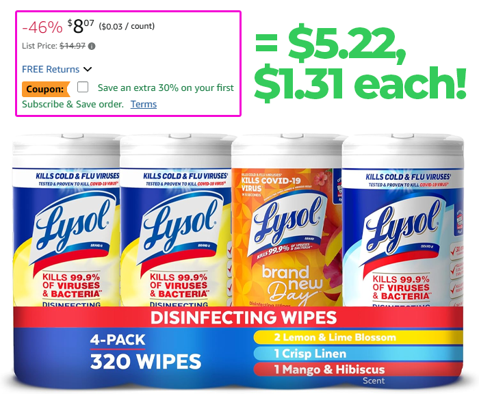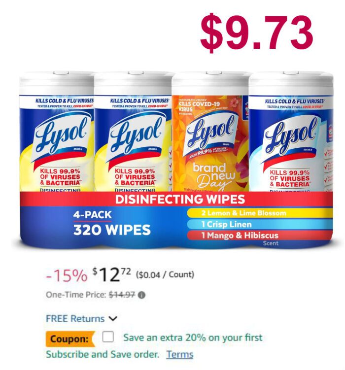 4-Pack Lysol Disinfecting Wipes Bundle $9.49 (reg $14.97)
