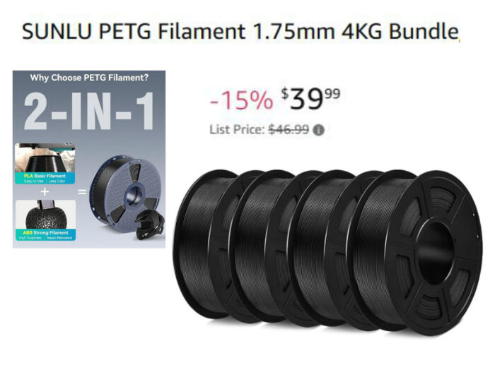 4-Pack SUNLU PETG Filament 1.75mm 4KG Bundle $39.99 (reg $46.99)