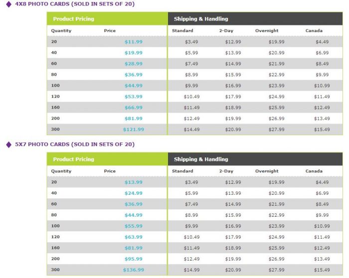 Their 4×8 cards are $19.99 for 40 cards, making it $10 with the code. Shipping is $5.99 for 40 cards, bringing the total to $15.99, just 40¢/card. Here is a sample of more pricing…remember to take 50% off that blue price (Click to get a bigger image).
