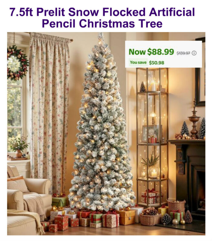 7.5ft Prelit Snow Flocked Artificial Pencil Christmas Tree $88.99 (reg $139.97)