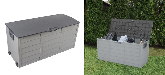 - Livio 260L Garden Storage Box With Wheels – Formed in hard-wearing and durable plastic which is water-resistant, weatherproof, and UV resistant, with a slatted wood-effect finish. A fully-sealed design protects against insects and other pests
