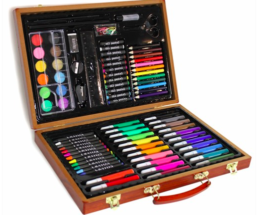 - Includes: 24 water color markers, 12 crayons, 12 oil pastels, 12 colore pencils, 1 scissor, 1 glue, 1 stapler, 1 sharpener, 1 ruler, 1 pencil, 1 eraser, 1 painting brush, 1 palette, 5 color clips, and 1 hardwood case