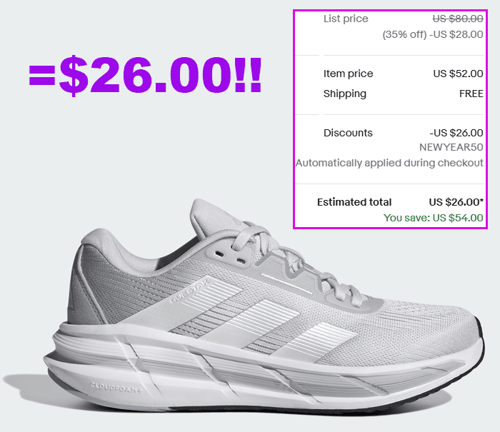 adidas Women’s Questar 3 Running Shoes for $52 (Reg $80) *Note: As soon as you select a size, it will switch to this all-white option as that’s all that’s available now*