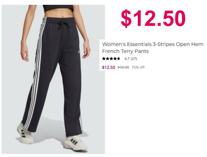 ADIDAS Women’s Essentials 3-Stripes Open Hem French Terry Pants $12.50 (reg $50.00)