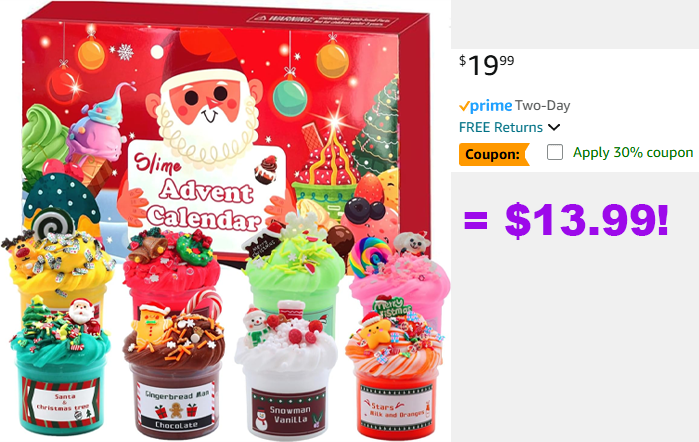 Kids will love this advent calendar! It includes 8 pots of slime in assorted colors and 23 different mix-ins.
