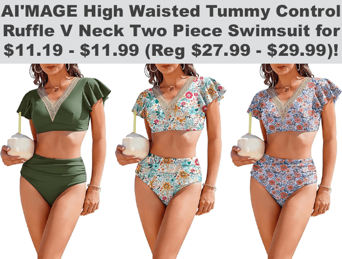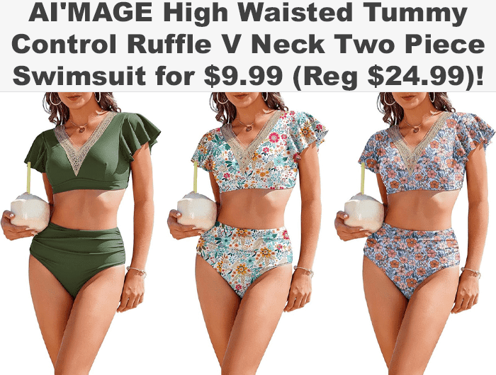 AI’MAGE High Waisted Tummy Control Ruffle V Neck Two Piece Swimsuit for $19.99 (Reg $24.99)