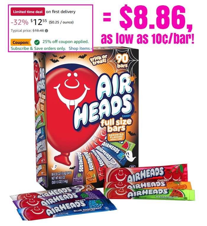 Airheads Candy Bars, Trick or Treat Mega Box, 90 Individually Wrapped Full Size Bars for $14.77