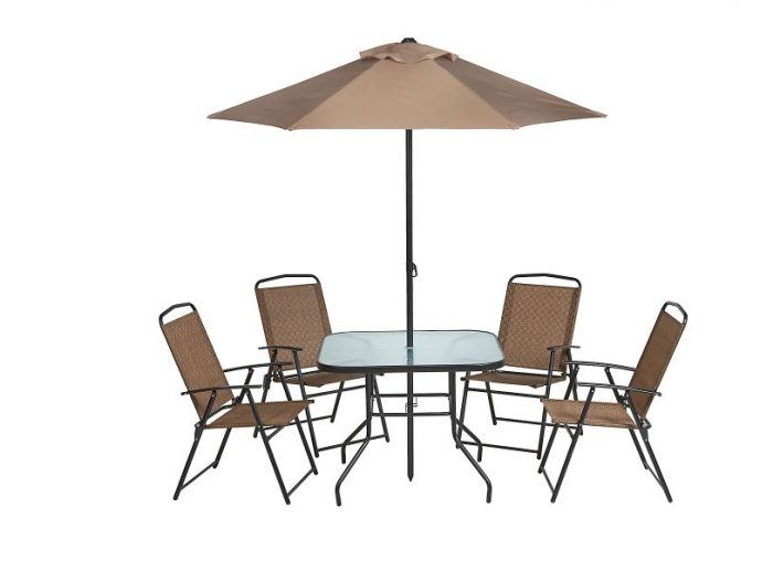 - Materials: Powder-coat steel (frame), vinyl (upholstery), tempered glass (table), 300-denier polyester with PU coating (umbrella)