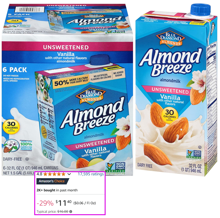 Almond Breeze Dairy Free Almondmilk, Unsweetened Vanilla, 32 Ounce (Pack of 6) for $11.40 (Reg $16)!