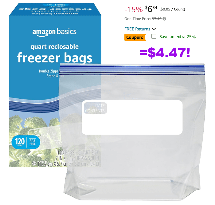 Amazon Basics Reclosable Freezer Quart Bags, Stand & Fill Base, 120 Count for $7.46