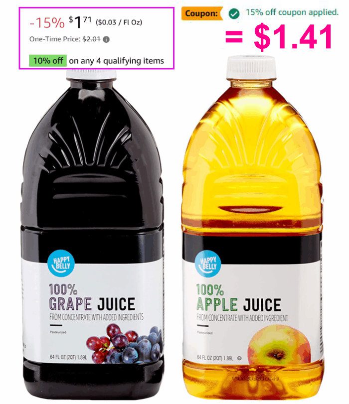 Amazon Brand – Happy Belly 100% Apple Juice or Grape Juice, Bottle, 64 fl oz for $2.01 (Reg $2.49)