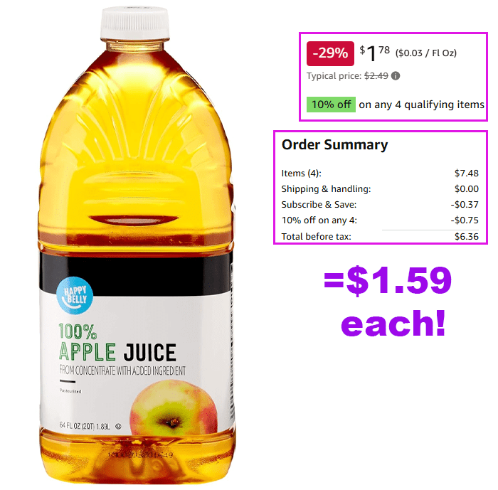 Amazon Brand – Happy Belly 100% Apple Juice or Grape Juice, Bottle, 64 fl oz for $2.01 (Reg $2.49)