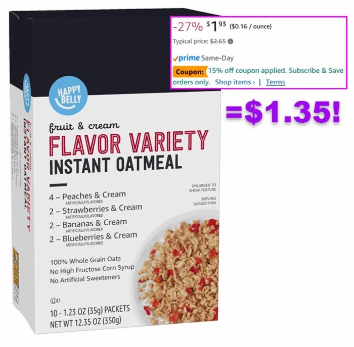 Amazon Brand – Happy Belly Instant Oatmeal, Fruit & Cream Variety Pack, 1.23 ounce (Pack of 10) for $1.35 (Reg $2.65)!