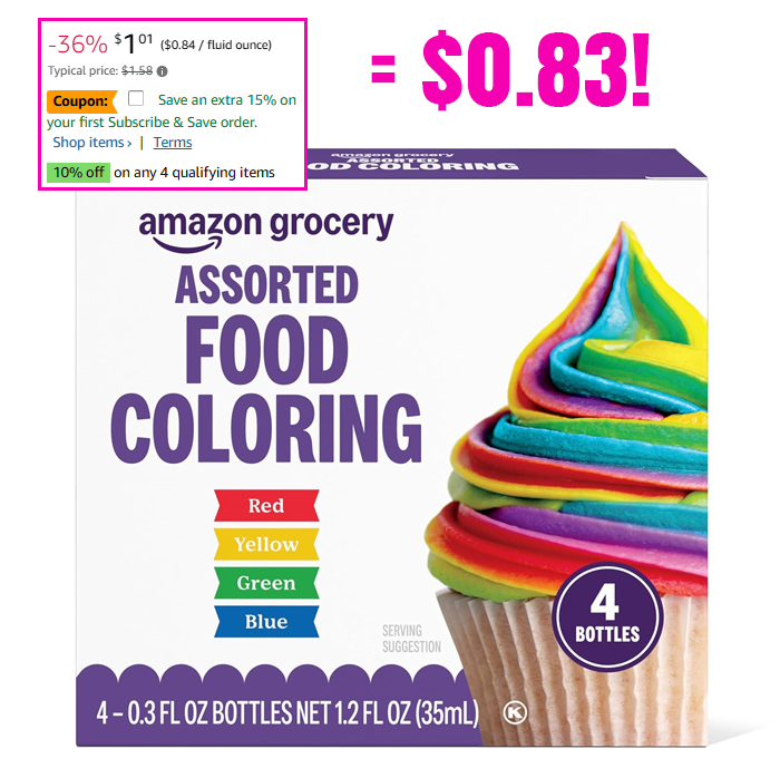 Amazon Grocery, Assorted Food Coloring, 1.2 Fl Oz for $1.19 (Reg $1.58)!
