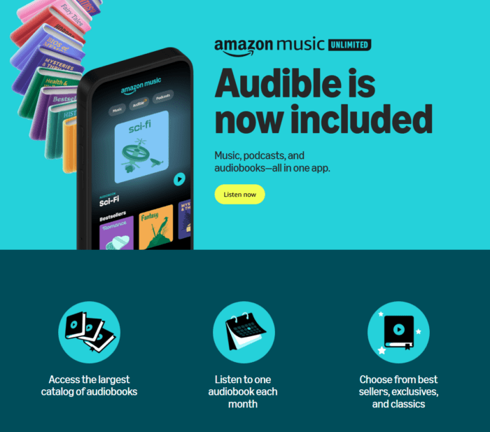 If you don’t have Amazon Music Unlimited, now is the time to sign up because it also now includes Audible! That means in addition to millions of songs (ad free), you’ll also get 1 free audiobook each month!