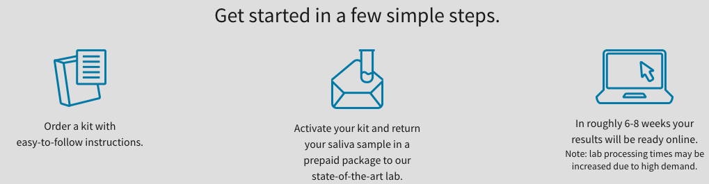 • It is quite simple to get a DNA test. Order your kit, when you receive it you will send back a saliva sample and mail it back to them. Within a few weeks, you will receive your results.