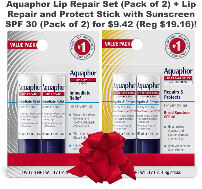 Aquaphor Lip Repair Set (Pack of 2) + Lip Repair and Protect Stick with Sunscreen SPF 30 (Pack of 2) for $11.08 (Reg $19.16)