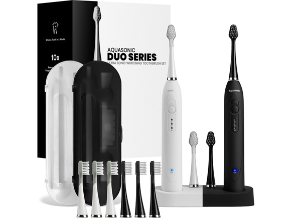 AquaSonic Duo Ultrasonic Whitening Toothbrush Set with 10 Brush Heads and 2 Travel Cases for only $39.99 (Reg. $99.99)