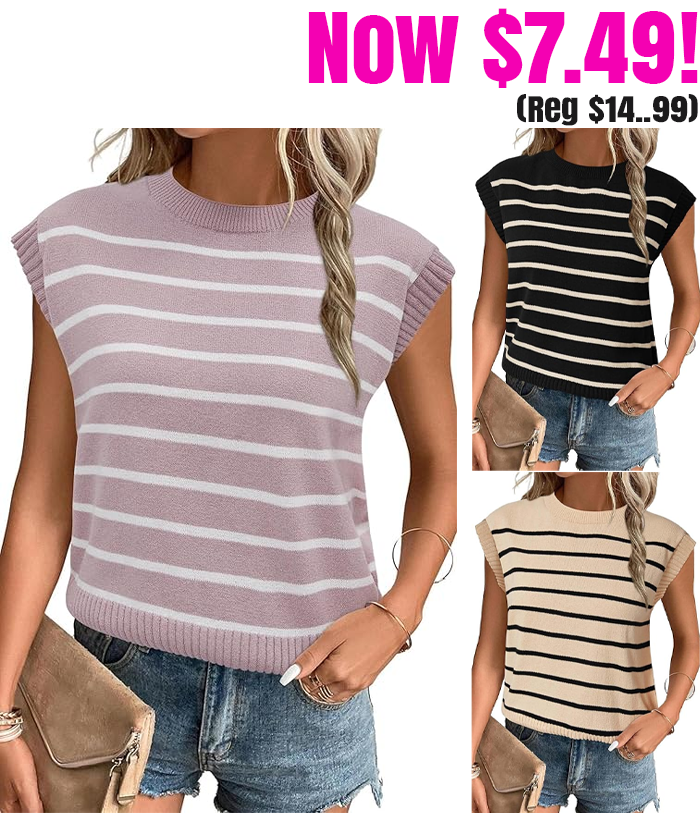 Arach&Cloz Striped Cap Sleeve Crew Neck Sweater for $14.99