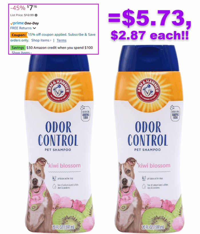 Arm & Hammer for Pets Super Deodorizing Shampoo for Dogs, 20 oz, 2-Pack for $7.16 (Reg $12.99)!.