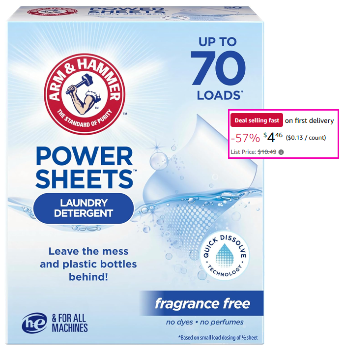 ARM & HAMMER Power Sheets Laundry Detergent, 35 Count, Up to 70 Small Loads for $5.25 (Reg $10.49)