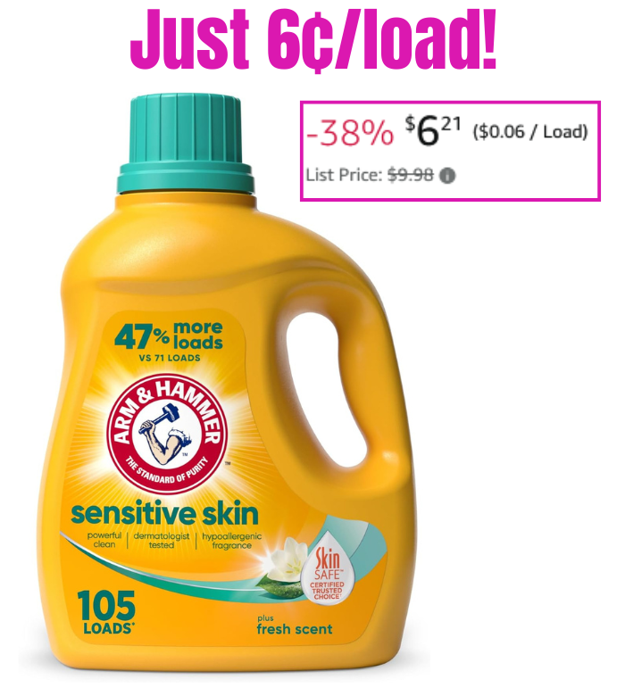 ARM & HAMMER Sensitive Skin Liquid Laundry Detergent, Fresh Scent, 105 fl oz, 105 Loads for $7.31 (Reg $9.98)
