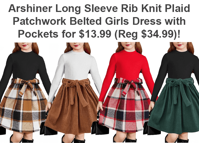 Arshiner Long Sleeve Rib Knit Plaid Patchwork Belted Girls Dress with Pockets for $34.99
