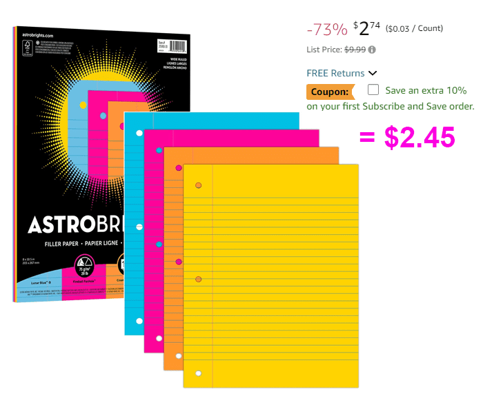 Astrobrights® Filler Paper, 8″ x 10 1/2″, Wide Ruled, 20 Lb, FSC® Certified, Assorted Colors, Pack of 100 Sheets for $2.88 (Reg $9.99)!