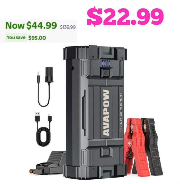 AVAPOW 12V 3000A Peak 23800mAh Car Battery Jump Starter (up to 8L Gas / Diesel) $44.99 (reg $139.99)