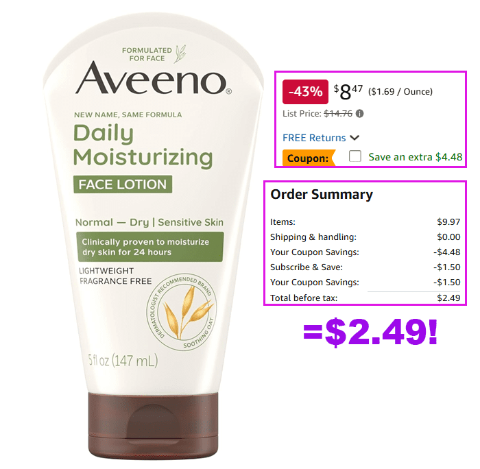 This lotion has Prebiotic Oat to intensely nourish dry, sensitive skin. Stack coupons plus check out with Subscribe and Save for this deal!